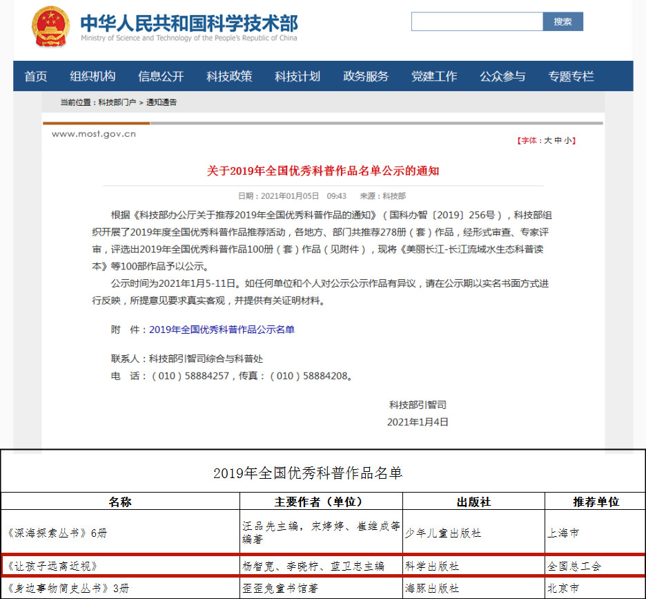 ? ? ? ? ?2021年1月4日,由楊智寬教授、李曉檸博士、藍(lán)衛(wèi)忠博士共同編寫的《讓孩子遠(yuǎn)離近視》一書入選中華人民共和國(guó)科技部?jī)?yōu)秀科普作品,是所有入選作品中一本眼科類科普書。