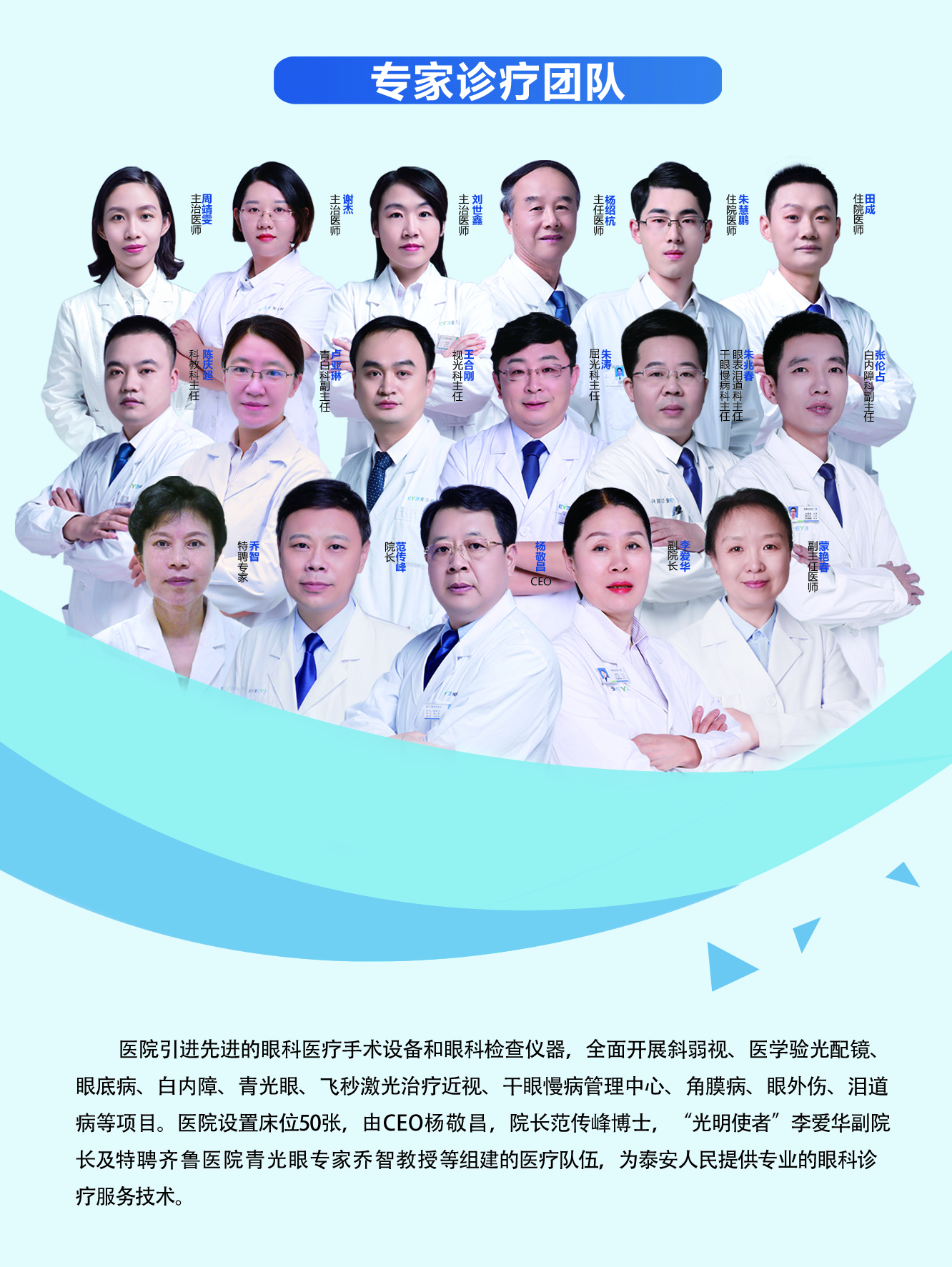 ? ? ?醫(yī)院具備良好的人才梯隊(duì)建設(shè)體系,眼科專(zhuān)家團(tuán)隊(duì)經(jīng)驗(yàn)豐富,技術(shù)精湛,目前醫(yī)院眼科中高級(jí)職稱(chēng)三十余人,眼科業(yè)務(wù)工作總量位居全市前列。由院長(zhǎng)范傳峰博士、“光明使者”李?lèi)?ài)華副院長(zhǎng)及特聘齊魯醫(yī)院青光眼專(zhuān)家喬智教授等組建的醫(yī)療隊(duì)伍,為泰安人民提供專(zhuān)業(yè)的眼科診療服務(wù)。