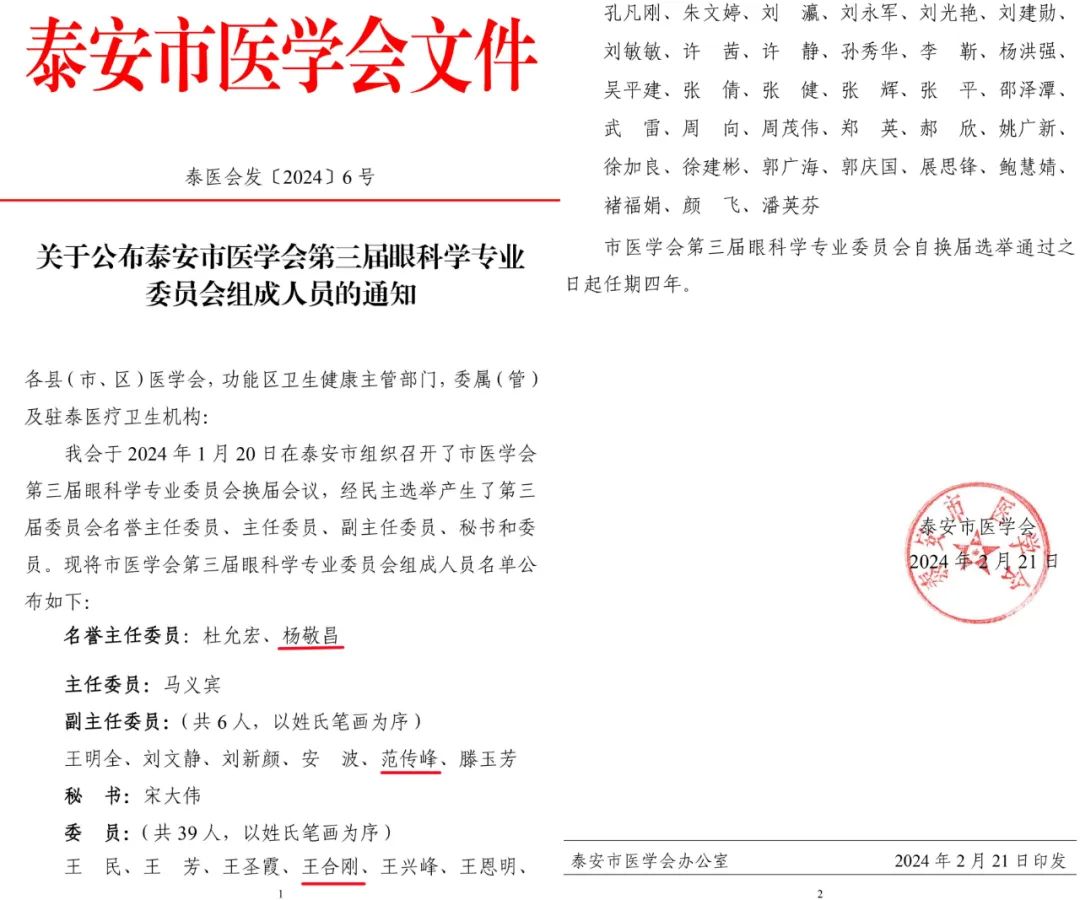 ? ? ?2月21日,泰安市醫(yī)學(xué)會正式發(fā)文《關(guān)于公布泰安市醫(yī)學(xué)會第三屆眼科學(xué)專業(yè)委員會組成人員的通知》。我院CEO楊敬昌擔(dān)任名譽(yù)主任委員、院長范傳峰當(dāng)選副主任委員、副院長王合剛成為委員之一。