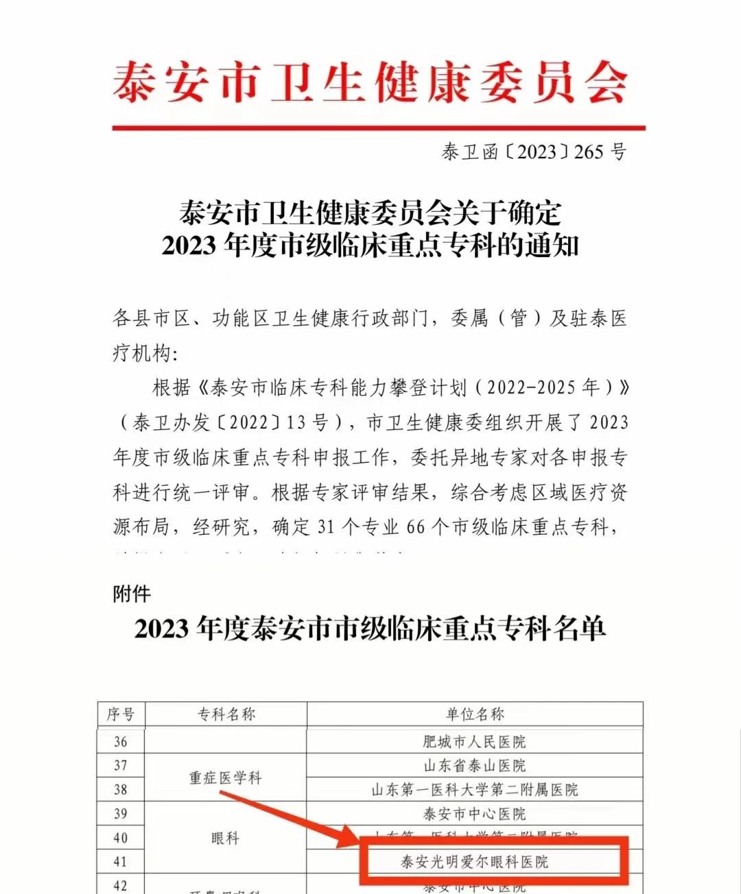 喜報!泰安光明愛爾眼科醫(yī)院評審為市級臨床重點??疲?
